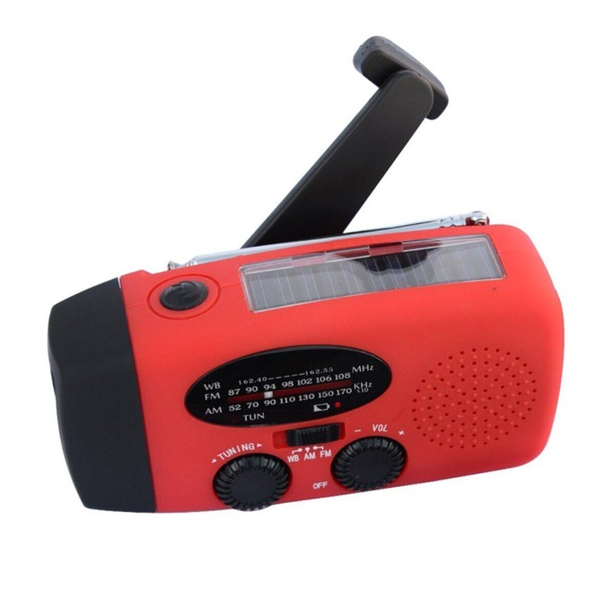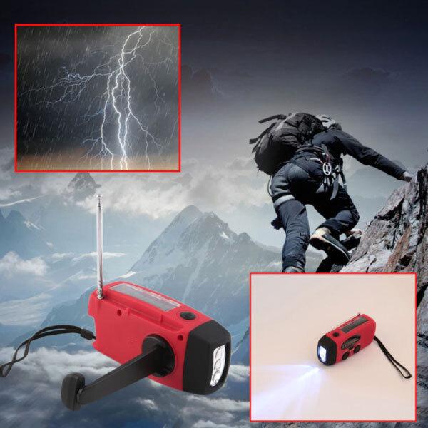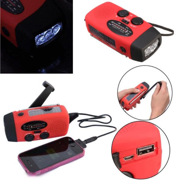 It comes with AM/ FM radio, LED flashlight, cell phone charger and jack accessories, dynamo/hand crank, solar power, and USB power/ charging.